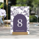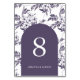 Elegant purple floral arch wedding table number.