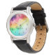 A personalized watch with a watercolor background featuring colors of the rainbow.