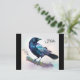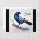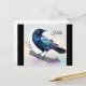 A postcard with a lovely watercolor drawing of a crow. Dark blue and vibrant purple colors accentuate the beauty of this bird.