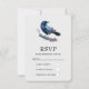 An RSVP card with a lovely watercolor drawing of a crow. Dark blue and vibrant purple colors accentuate the beauty of this bird.