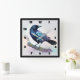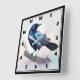 A clock with a lovely watercolor drawing of a crow. Dark blue and vibrant purple colors accentuate the beauty of this bird.