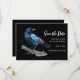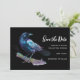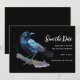 Save the date card with a lovely watercolor drawing of a crow. Dark blue and vibrant purple colors accentuate the beauty of this bird.