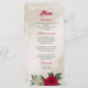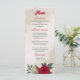 Unique wedding menu card featuring romantic red and pale yellow flowers and green leaves.