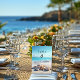Pretty image of a beach with beautiful white sand, rolling waves and turquoise water, Sand dollars and Starfish table number card.