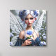 A beautiful blue haired fairy with silvery wings wearing a pretty blue dress and sapphire jewelry holds a single aster while standing in a field of asters.