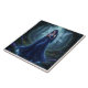 A beautiful fairy wearing a flowing dark blue dress and a necklace made of sapphires with sapphires in her long dark blue hair and translucent dragonfly-like wings holding an aster stands in a shallow pond in a magical forest surrounded by asters, orange mushrooms and trees covered in vines, flowers and mushrooms.
