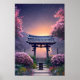 This digital artwork captures the essence of a peaceful and serene scene in Japan. A small, traditional Japanese shrine is nestled among charming flowers, creating a tranquil and serene atmosphere. As the sun sets in the distance, the orange hues paint a beautiful and breathtaking view that complements the scenery perfectly. This piece is the ideal addition to any space looking for a calming touch of nature.