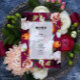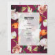 An elegant & fancy wedding menu design with a mix of beautiful summer flowers background on a magenta background and customizable black typography on a transparent white and gold frame background.