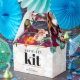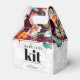 An elegant & fancy wedding favor box recovery kit design with a mix of beautiful summer flowers on a white and magenta background and customizable black typography on a transparent white and gold frame background.