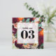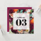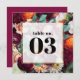 An elegant & fancy wedding table number design with a mix of beautiful summer flowers background on a magenta background and customizable black typography on a transparent white and gold frame background.