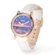 A watch with a lovely photograph featuring striking colors of purple, blue and pink at sunset.