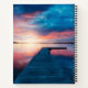 Spiral notebook with a gorgeous photograph. A scenic spot. A nice calm lake with a wooden dock stretching outwards. Setting sun provides beautiful colors in the sky, vibrant red and blue.