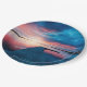 Paper plates with a gorgeous photograph. A scenic spot. A nice calm lake with a wooden dock stretching outwards. Setting sun provides beautiful colors in the sky, vibrant red and blue.
