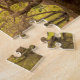 110 puzzle pieces come together to create this beautiful scene of a twisted old tree whose branches reach out over a small pond, glowing yellow in the early morning sunshine.
