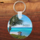 A keychain with a scenic photograph. A clear blue ocean with a white sandy beach.