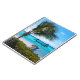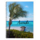 Spiral notebook with a scenic photograph. A clear blue ocean with a white sandy beach. A palm tree swaying in the wind.