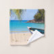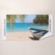 Towel set with an idyllic tropical beach scene. Turquoise blue crystal clear water and a soft brown sandy beach. Some palm leaves hanging down from above. An old wooden rowboat sits on the beach. A serene and peaceful landscape.