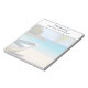 A personalized notepad with an idyllic tropical beach scene. Turquoise blue crystal clear water and a soft brown sandy beach. Some palm leaves hanging down from above. An old wooden rowboat sits on the beach. A serene and peaceful landscape.