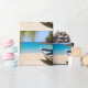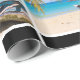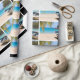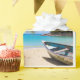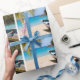Wrapping paper with an idyllic tropical beach scene. Turquoise blue crystal clear water and a soft brown sandy beach. Some palm leaves hanging down from above. An old wooden rowboat sits on the beach. A serene and peaceful landscape.