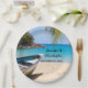 Wedding paper plates with an idyllic tropical beach scene. Turquoise blue crystal clear water and a soft brown sandy beach. Some palm leaves hanging down from above. An old wooden rowboat sits on the beach. A serene and peaceful landscape.