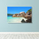 Canvas print with a photograph of a turquoise blue ocean beach with big rocks scattered along the coast. Bright and sunny tropical locale.