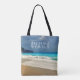 A personalized tote bag with a beautiful photograph featuring a turquoise blue sea and a sandy beach with waves of foamy surf.