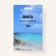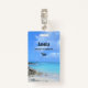 Name badge with a scenic tropical photograph. A secluded beach with white sand and turquoise water.