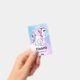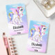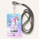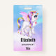 Personalized name badge with an image of a unicorn with big blue eyes, pink wings and a rainbow mane and tail. Kawaii cute.