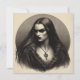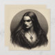 This square card features an exquisite antique-style illustration of a mesmerizing lady vampire, rendered in soft, moody tones that echo the romantic darkness of vintage gothic artwork. Her long, flowing dark hair cascades in waves around her shoulders, framing a face that is equal parts ethereal beauty and quiet menace. With her fangs just barely bared and a gaze that is both seductive and haunting, she seems to emerge from another time—a figure from a long-forgotten dream or an old vampire tale whispered by candlelight. Her presence on the card evokes the allure of classic horror and the decadent charm of gothic romance, blending elegance and danger in a way that is utterly captivating. The image recalls 19th-century engravings and vintage lithographs, giving the card an aged, mysterious quality that feels as though it might have once belonged to a Victorian collector of the strange and supernatural.