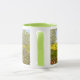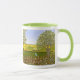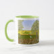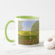 A mug with a beautiful image of a nature scene: A bird sitting on a weathered fence, wildflowers growing around the fence, a farmer on a tractor, working his land, trees with leaves, and farmland with various colors. The background and image can be customized. Text may be added. Original artwork by W.B.