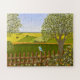 A puzzle with a beautiful image of a nature scene: A bird sitting on a weathered fence, wildflowers growing around the fence, a farmer on a tractor, working his land, trees with leaves, and farmland with various colors. Original artwork by W.B.