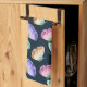 A kitchen towel with a beautiful pattern. Watercolor butterflies, painted in pastel colors including pink, purple, blue, yellow and green. Dark blue watercolor background.