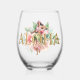 Aloha stemless wine glass featuring watercolor hula dancer and faux gold lettering and plumeria.