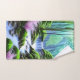 This graphic is a beautiful, lush forest with an elegant waterfall pond. The light blue flowers, light pink and lilac flowers, ferns, green trees, flora, and fauna create a stunning natural landscape. This hand towel adds color and action to the bathroom.