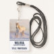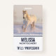 Name badge with a photograph of a gorgeous white horse. Running through a snow covered field. Majestic and beautiful.