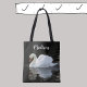 Both sides of this all over print tote bag feature an elegant white mute swan, and you can personalize the front with your name. The photo has been digitally enhanced to bring out the whiteness of the swan against the dark black water of the canal it is swimming on. The swan is beautifully reflected in the water and the feeling is peaceful.