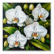 A detailed artwork of vibrant white orchids complemented by lush green foliage, displayed against a textured golden-brown background, showcasing the elegance and beauty of floral arrangements.