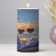 A beautiful, serene scene of two wine glasses on a rustic table adorned with candles and flowers, set on the beach with the ocean in the background and the sun setting.