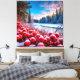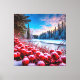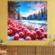 Vibrant winter scene with frosted red berries and snow-covered pine trees surrounding a frozen lake. A colorful sunrise casts a serene, picturesque atmosphere, blending nature's vivid hues with the quiet tranquility of winter.