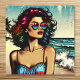 Pretty ai generated image of a pretty lady on the beach wearing sunglasses with an ocean beach background comic book style pop art.