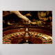 Photograph of beautiful finished-wood roulette wheel on a roulette table occupied by a dealer and several gamers
