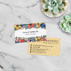 Colorful floral business card with rows of flowers in coral, blush, blue, and yellow framing your name and profession written in a charming serif font. Eye catching vibrant business card with lots of flowers for any profession, like home styling, interior design, beauty, and more. Add your contact info to the back in black text against light yellow with cute business card icons for address, phone number, social media and more.