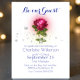 This Beauty and the Beast fairy tale themed party invitation features a white background with royal blue colored text. A magical glowing red rose is placed in the center. Diamond dust is scattered across the rose, creating an enchanting look. The phrase "Be our Guest" is printed in a whimsical, fairy tale style font above the rose.