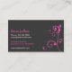This beauty salon business card in pink and gray features a logo of a woman lying down with a nice script font for the business name, fancy leaf embellishments at the side, and space to include a list of salon services, such as, massage, body treatments, sun beds, spray tan, waxing, electrolysis, eyes, brows, hands, nails and feet. This business card would be suitable for a range of beauty businesses.