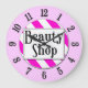 A unique wall clock reading Beauty Shop in retro letters on a pink and white striped background surrounded by black numbers on a pink face. Click Customize It to change background colors and more, even save your design for later.