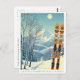 Hello from the snowy mountains of Beaver Creek Colorado USA! We hope you're having a wonderful ski vacation. This postcard features a gorgeous blue-grey mountain landscape with retro ski boards in an orange tribal pattern.