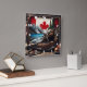 A beaver poses on a log beside a river, with a Canadian flag backdrop featuring mountains and pine trees, symbolizing Canada’s natural beauty.