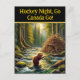 A beaver stands in a rushing river, holding a branch as if it were a guitar, in front of a beaver lodge in a forest.