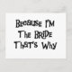 Simply stated, because you're the bride, that's why! This humorous but simple black text Because I'm the Bride design on T-shirts, mugs, buttons, bags, and more will get a few chuckles!