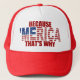 It's the original BECAUSE "MERICA That's Why Trucker Hat! Featuring the award-winning and best selling 'MERICA U.S. Flag design, and the very funny patriotic meme. The perfect hat for the 4th of July, Memorial Day, Presidents Day, Veteran's Day, or ANY day of the year! Grab yours today from this American Zazzle Pro-seller, and wear it with pride!